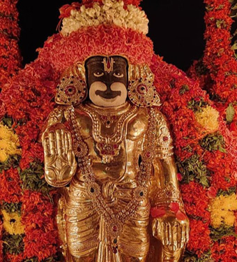 Hanuman, who is Pancha Mukha Swaropa (five faced ) shower's blessings on the devotees on offering Panaka Nivedyam to the Narasimha Mukha , which is renowned tradition
